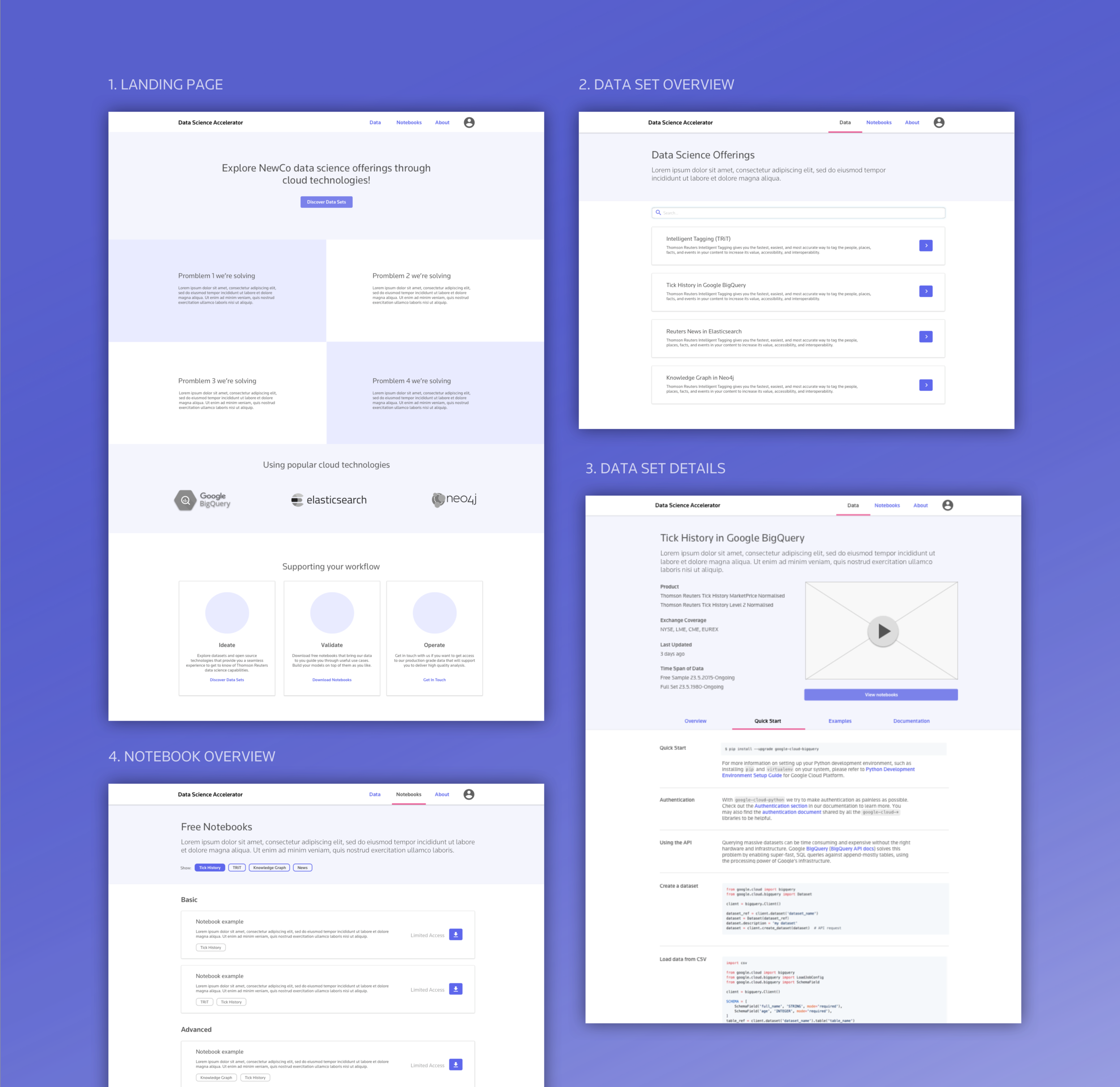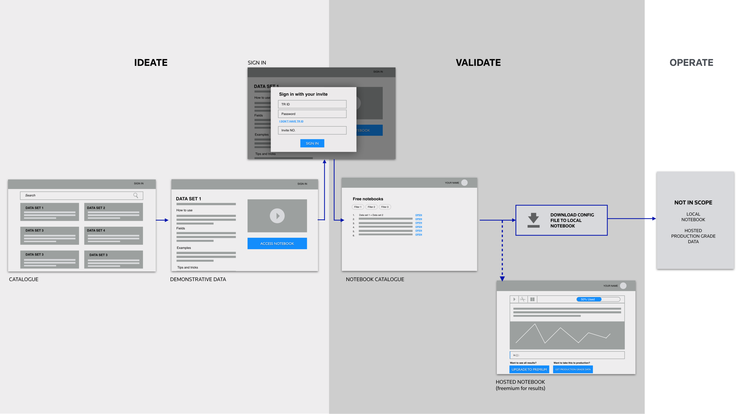 Wireframes of the Data Science Accelerator concept. The concept was sketched and iterated alongside the interviews. An simple wireframe workflow was presented to the data scientists so that they could reflect how well it fits with the current way of working.